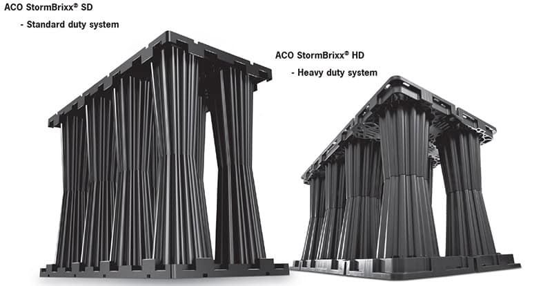 ACO StormBrixx® HD is designed for heavy-duty applications and ACO StormBrixx® SD is designed for medium duty applications.