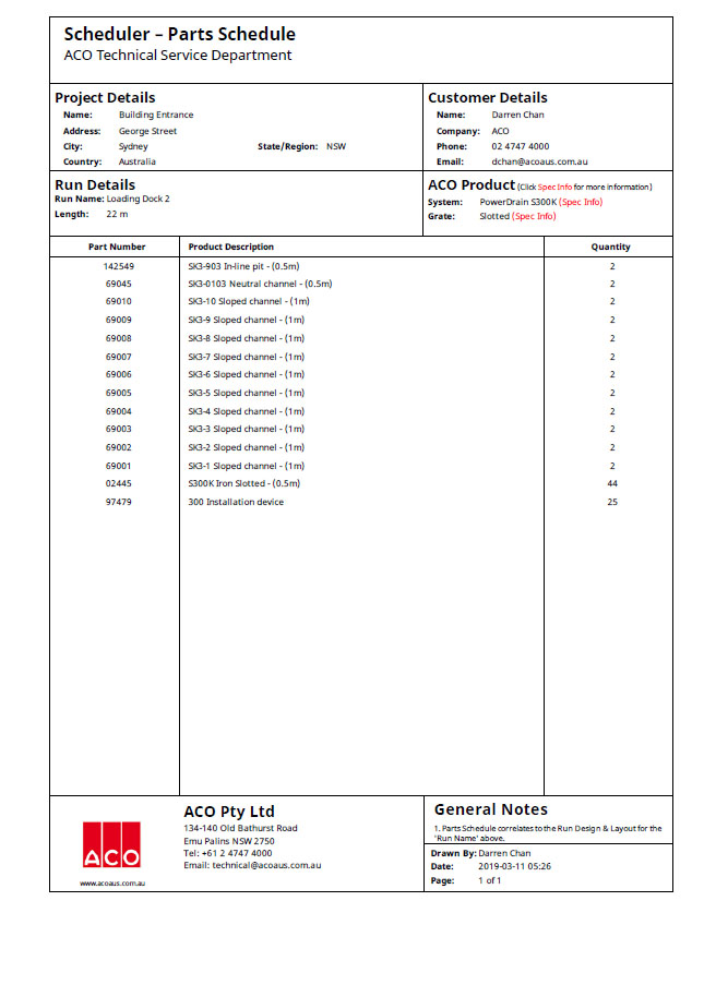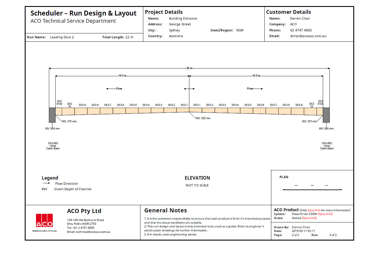 ‘Scheduler’ is a purpose written software program that shows trench drain run layouts in plan and elevation views including the position of outlets and accessories.