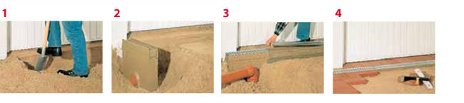 For pedestrian only applications, trench drain can be set directly on well compacted soil. For driveway applications, trench drain MUST be surrounded 100 mm of concrete.