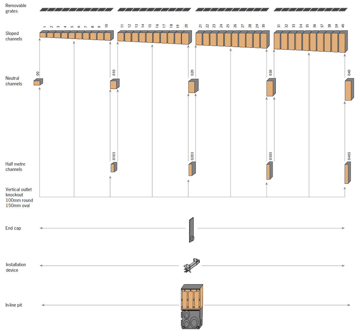 2. Preformed 150mm and 200mm diameter knockouts cast on underside of certain channels (00, 5, 10, 010, 0103, 15, 20, 020, 0203, 25, 30, 030, 0303, 35, 40, 040, 0403).