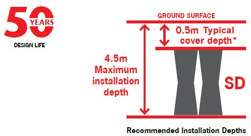 | Typical cover depth (see image above): 0.5m – landscaped 0.6m – car park |